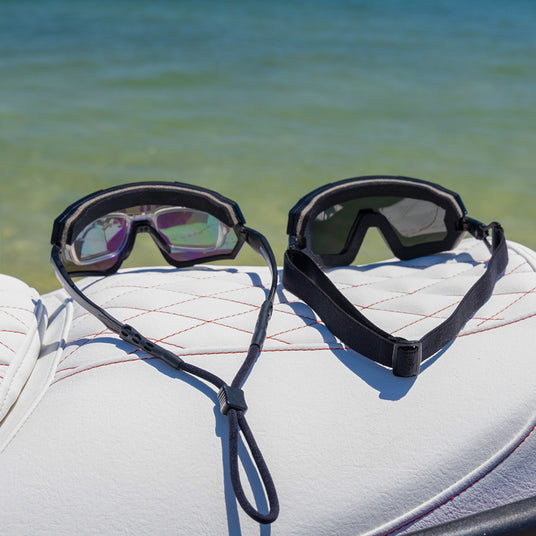 They’re a modular 2-in-1 system. In calm conditions, wear them as polarised sunglasses. When speed, wind or spray increases, attach the foam gasket and strap to convert them into sealed goggles.